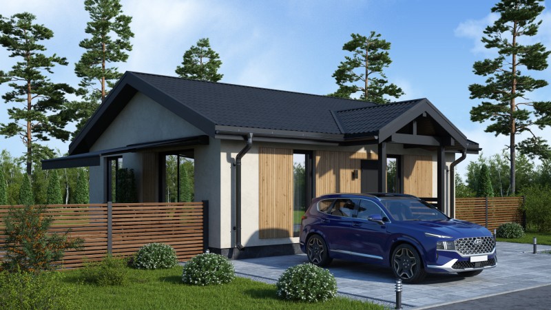 Компактный функциональный одноэтажный дом с оригинальным фасадом и двухскатной кровлей. Имеет 2 планировки две спальни или 3 спальни, кухню гостиную с выходом на террасу, котельную-постирочную, в которой можно разместить второй санузел.