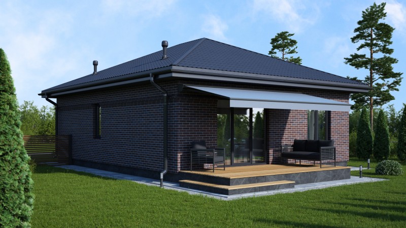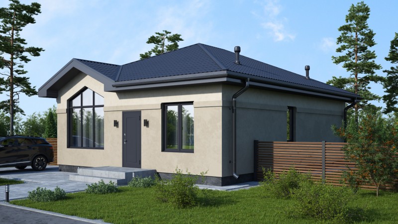 Компактный функциональный одноэтажный дом с оригинальным фасадом и интересной кровлей. Имеет три спальни, кухню гостиную с выходом на задний двор, котельную-постирочную, второй санузел можно разместить в котельной постирочной.