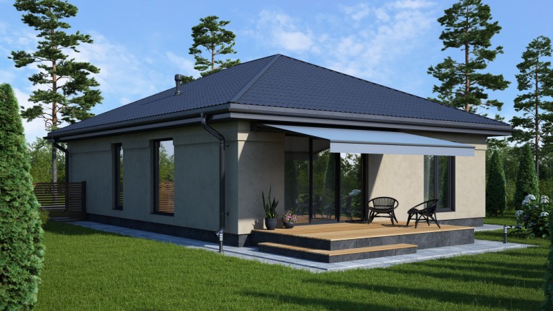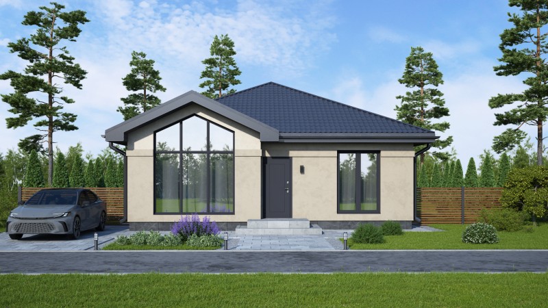 Функциональный одноэтажный дом с оригинальными комбинированными фасадами, интересной кровлей. Имеет три спальни, одна из них мастер спальня с гардеробной и санузлом, просторную кухню гостиную с выходом на задний двор, котельную‑постирочную, второй санузел.