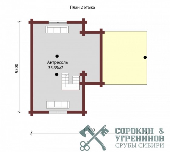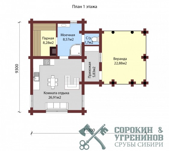 Сруб бани рубленый из бревна кедра диаметром 260мм площадью 109,56м2. Размер сруба 9,3х11,7 метров по осям. Баня с мансардой. Парная, мойка, санузел, тамбур, раздевалка, комната отдыха и большая веранда, на втором этаже антресоль. Сруб рубленый вручную (канадская рубка), брёвна окоренные гидро-окоркой (водой под высоким давлением), а так, же это можно сделать скобелем или лопатой, или строганное рубанком. Объем бревна в срубе 75м3.