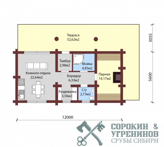 Сруб бани рубленый из бревна кедра диаметром 260мм площадью 109,8м2. Размер сруба 5,6х12 метров по осям. Большая баня с просторной парной, отдельной мойкой, есть санузел, тамбур, раздевалка и большая гостиная комната, терраса. Сруб рубленый вручную (канадская рубка), брёвна окоренные гидро-окоркой (водой под высоким давлением), а так, же это можно сделать скобелем или лопатой, или строганное рубанком. Объем бревна в срубе 65м3.