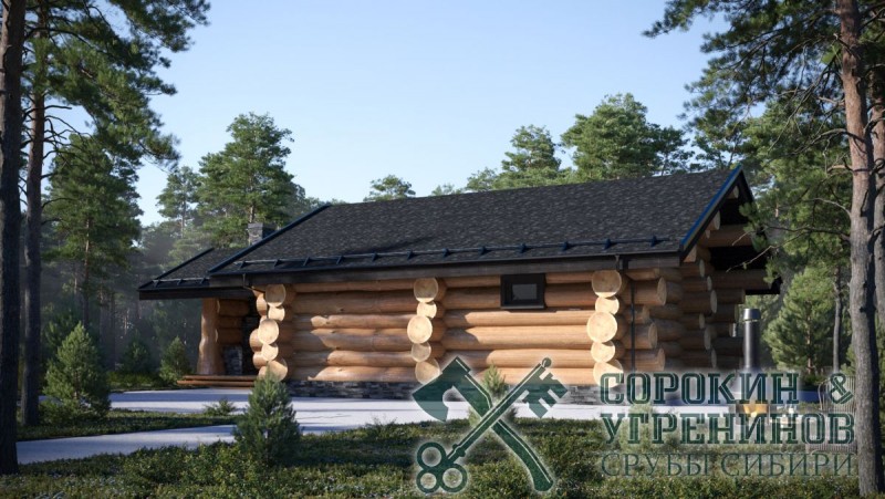 Сруб бани рубленый из большого бревна кедра диаметром 500мм площадью 81,62м2. Размер сруба 8Х15,5 метров по осям. Баня с террасой для барбекю. Парная, мойка, комната отдыха и сунузел. Сруб рубленый вручную (канадская рубка), брёвна окоренные гидро-окоркой (водой под высоким давлением), а так, же это можно сделать скобелем или лопатой, или строганное рубанком. Объем бревна в срубе 90м3.