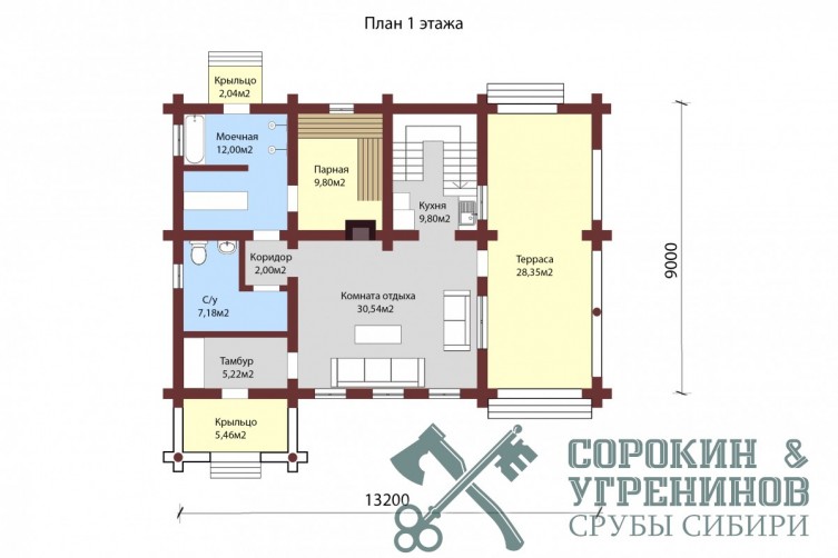 Проект дома-бани из бревна диаметром 300мм, размер бани 11х13м. Объем бревна в срубе 155м3, общая площадь сруба 186м2. На первом этаже парная, душевая, санузел, гостиная с кухней, закрытая терраса с печью барбекю, крыльцо. На втором этаже холл, две спальные комнаты, балкон. Есть еще большая терраса с печью барбекю.